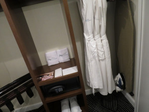 バスルームに入る手前がクローゼットになっています。中にはバスローブ、アイロン、セキュリティボックスそしてスリッパなどが十分準備されています。