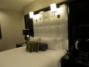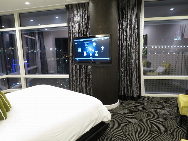 ベッドは軟らかめですが寝心地は悪くありません。クッションも数多く揃えられています。ナルホドの設定です。そして壁が・・すっごい作りですね。かなりアバンギャルドな雰囲気でWホテルに近い感じを受けました。