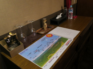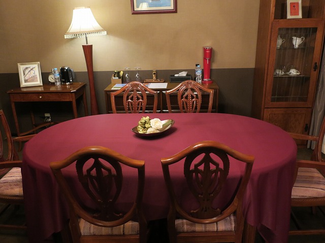 部屋の真ん中には四人掛けの大きなテーブルが赤いクロスでセットアップされています。上にはバラの摸造花が置かれています。ただしPCを使うには電源が遠くて不便です。WiFiも無いので自分の携帯でデザリングして接続します。この部分は要改善でしょうね・・いまどきスマートフォンやPCを使わないことは無いと思います。
