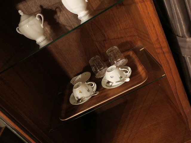 カップなどは窓側の食器棚にセットされていますが品が良いですね。朝起きた時のコーヒーはまた格別でした!