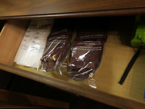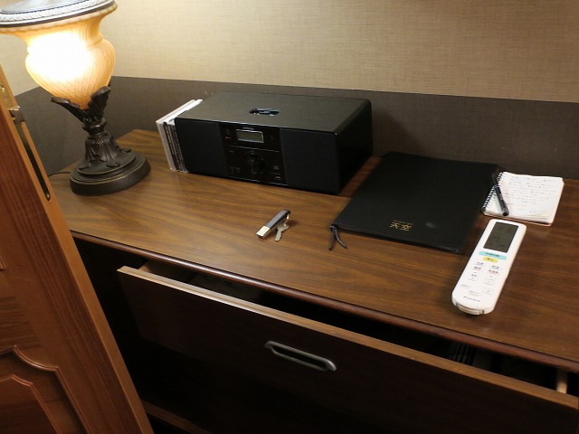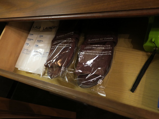 ベッドルームとの接続部分の棚にCDやホテルのディレクトリがあります。今回はバタンキューだったので音楽を聴く時間はあまりありませんでした。引き出しにはスリッパやラウンドリーバッグそして殺虫剤などが入っています。