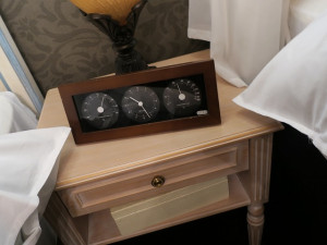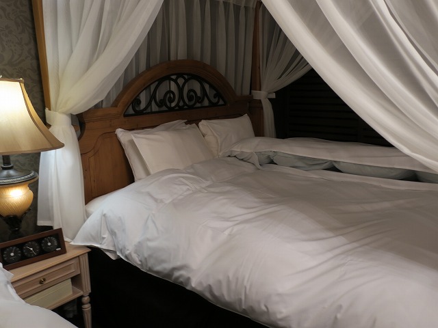 リビングから寝室に移動すると天板付きのベッドがドーンと見えます。寝心地も良くマットレスもしっかり効いています。ベッドサイドには電灯と時計などがあります。電灯のコントロールは枕元にありませんが気になりません。しかし気になるのが・・となりのシングルベッドです。なぜ其処にあるのか・・・?あっても困りませんが、部屋のデザイン・雰囲気を自ら悪くしています。