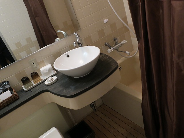 リビングからお風呂に入れるようになっています。内装は良いような変なような・・ユニットバスではないのですが古いというか・・水回りのリノベーションはしにくいのは理解できますが、これではビジネスホテルです。雰囲気を変えようとしているのは理解できるのでセパレートの仕方や変なカーテンは合わないと思います。