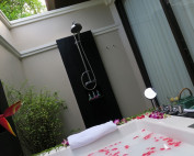 バンヤンツリーと言えばやはりお風呂です!リビングから見ても相当に広くて深いバスタブが気になります。しかし実際にはお風呂に湯を張るには時間が掛かります。今回は外のプールとシャワーで十分でした。多分スタッフにお願いすればフラワーバス等も手配してくれたのだと思います。