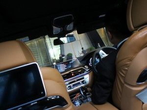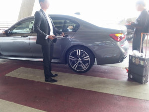 車は最近乗ることが多いBMWの7シリーズです。ただしホテル名は車には明記されていません。中にはレターケース・靴磨き・ペン・iPAD・レターケース・水(パークハイアット仕様)と出来る事は全部やってあります。