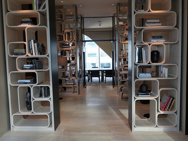 ロビー階のエレベータを降りるとバーがあります。先に進むとライブラリを右手に更に先がレセプションです。レセプションの手前を左に下っていくとダイニングになります。