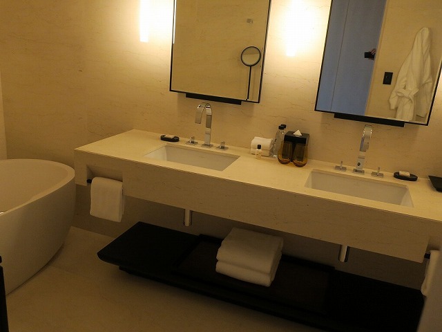スイートではありませんがシンクがダブルです。つまり・・このホテルは総てダブルのシンクなんでしょうね。朝の忙しい時間をカップルで来るには良い選択です。女性も気兼ねなく使えるでしょう。スピーカもありテレビと連動しているようでした。私は使わないので確認まではしていませんが。ドライヤもアメニティキットの下の棚に入っています。