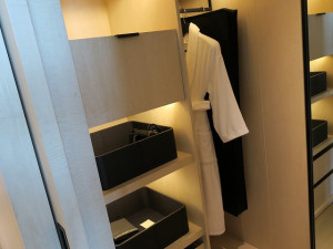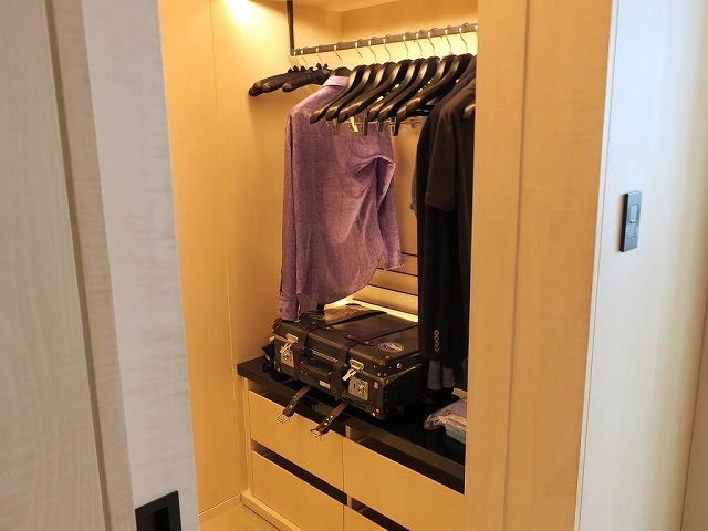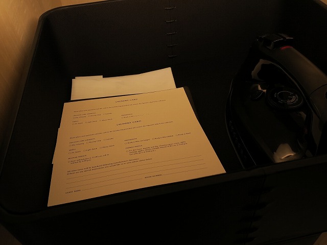 お手洗いの先はクローゼットになっています。広さは必要最低限ですが基本機能はシッカリしています。ランドリー(翌日仕上とAM8-PM9までの受付なら3時間の急ぎ)や靴磨きのサービス用のバスケットもあります。そしてアイロンにアイロン台も準備されています。