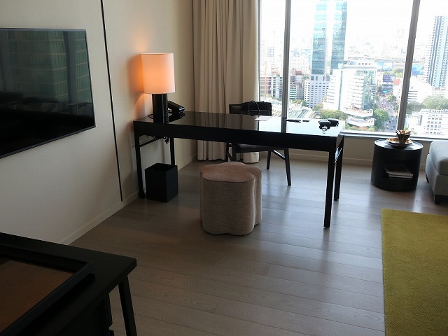 そして部屋の奥の角には書斎机です。これが真黒で微妙に違うのですがパークハイアット上海の机を思い出させます。机には椅子が必要ですがクラシックな椅子とオットマンがあります。座ることもできますが、このオットマンは最高です。今回は色々と処理をしたのですが(ブログを書くのも含めて)椅子に長時間座ると疲れるので偶に足を上げるこの設定は良いです。他のホテルも導入してくれるといいですね。ナイスアイデアなので自分の家にも早速準備します。
