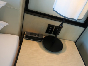 もちろん私は寝るときにはカーテンを総て全開です。枕元のコントローラで電灯や電動でレースおよびシェードのカーテンをコントロールできます。カーテンはボタンを二度押すと途中でも停止することができます。左の枕元にはBOSEのサウンドリンクミニがありブルートゥースでiPhoneと接続して楽しみます。バッテリーも内蔵されているので場所を選ばず使えます。ホテルでのオーディオはブルートゥースでの接続がメインになってきましたね。今回も私の好きな音楽で部屋では時間をすごしました。
