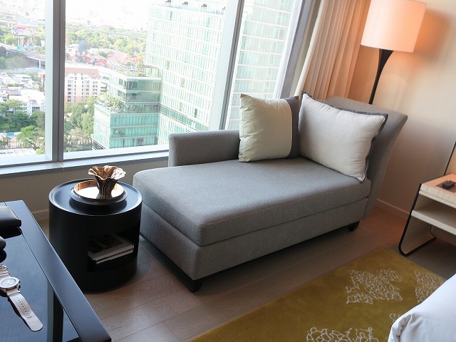 窓側にはディベッドがあります。クッション二つに包まれてバンコクのシティラインを楽しみながら微睡むと最高の気分です。