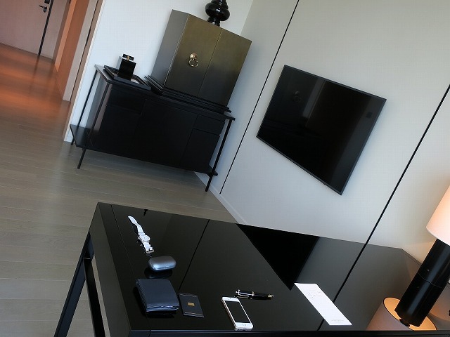 ベッドの向かいの壁にはテレビが設置されています。前に引き出すこともかなりできるのが良い点です!もちろんスマートテレビなのでホテルとの連絡や課金情報もここで確認することができます。とは言えど私はみませんが・・・むしろ自分の持ち込んだデバイスとの連携が良いです。テレビの画面をペアリングしたりと色々と機能があります。またテレビの前に少しスペースがありますがルームサービスをお願いした場合などに活躍するようになっています。