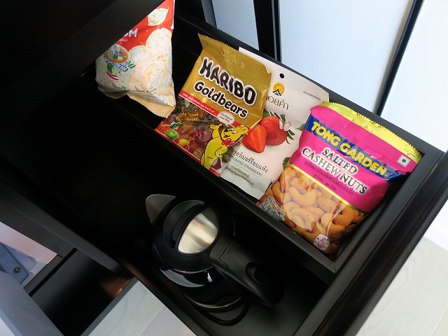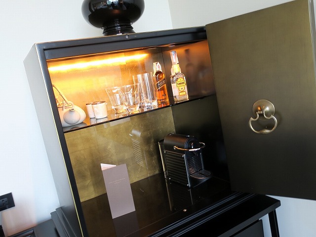 部屋に入って直ぐ左手にミニバーがあります。パッと見ると分かりませんが、タイらしいデザインでできています。上の棚を開けるとリカーとエスプレッソマシーンです。そして何故か急須です。タイにもありますがパッと見ると日式ですね!