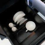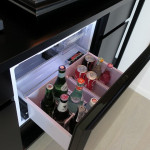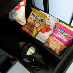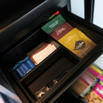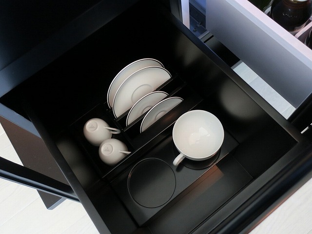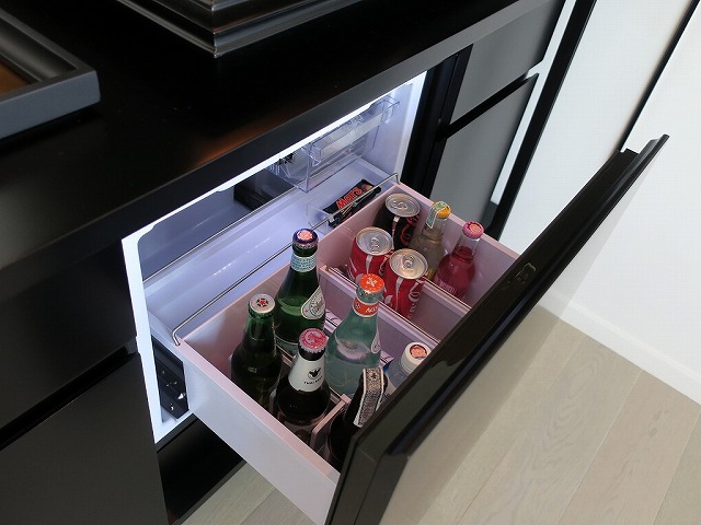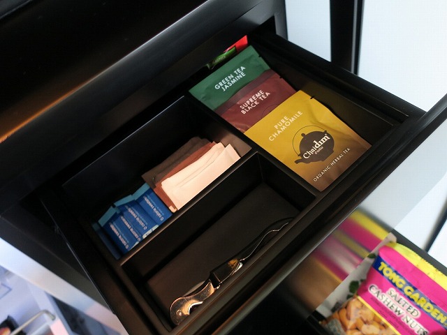 下の棚の真ん中には冷蔵庫です。収納が最近らしいですね。引き出して上に抜き取るので下に設置してある場合には楽です。品数もそれなりにあるので良いですね。本当はサンペレグリノを飲もうかと思いましたが、蓋が閉めにくいパターンだったのでペットボトルのスポーツウオーターにします。しかし収納をしっかりしないと、飲み物と冷蔵庫が共振して寝ている時にコンプレッサーの音がビーーーンと響くので気を付けてください。棚の左右にはケルトにカップや紅茶そしてスナックが準備されています。やはり綺麗にまとめてくるのはパークハイアットですね。