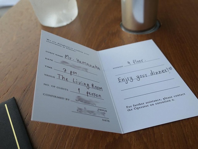 チェックイン時に色々と確認し、夜は軽く食べたかったのでリビング・ルームを予約しておきます。しかしこれは後で良い意味で変更されます。