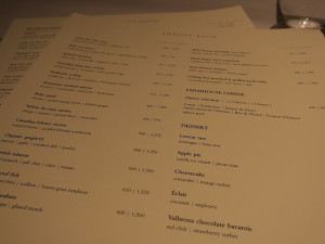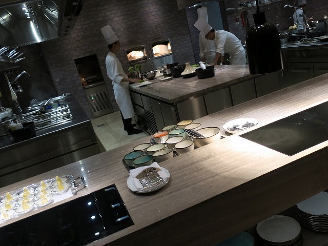 食べたかったのはテンダーロインのステーキだけだったのでメニューを見ながら相談しますが・・遠くに立派な窯が見えます。こうなるとステーキはブラック&ブルーで食べたくなるのでスタッフにお願いします。スタッフは分からないのでシェフに確認に行っていただきます。するとメインシェフが来られて焼き方を確認します。シェフもブラック&ブルーは知らなかったので説明すると「新しいアメリカンスタイルの焼き方だけど問題なくできる」との頼もしい返事です。前菜については食べる気は無かったのですがシェフから絶対のお勧めを入れておくと言われてOKします。他のスタッフの話を聞くとフランスから来られたシェフで基本はフレンチベースの食事を得意とするそうです。確かに!