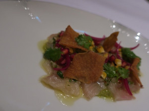 先ずは前菜を頂きます。これもシェフが持って来て頂き料理の特徴を説明してくれます。私には発音が聞き取れなかったのですがチュチェと言った食べ物のようです。中身はカルパッチョとソースそして香辛料が混じった素晴らしい内容です。すこしタイの食材もありステーキへの期待が高まります。