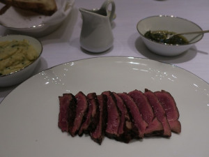 焼きあがるまでに相当の時間をかけて頂き出来上がります。またシェフが持って来て頂き説明を受けます。既にカットされた状態だったのは想定外ですが、肉の焼き方は出来ています。周りはクリスピーで中はレアです。シェフ曰く「焼き方が難しかったが、自慢のソースと絡めて是非に食べてくれ」とのお勧めです。塩も美味しかったのですが、ペッパーソースは更に味が絡んで美味しくいただけます。ブラック&ブールのフレンチ版ですね!美味しくいただきました。