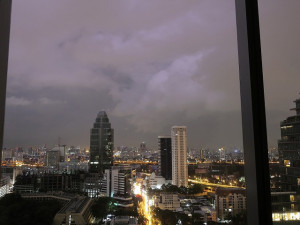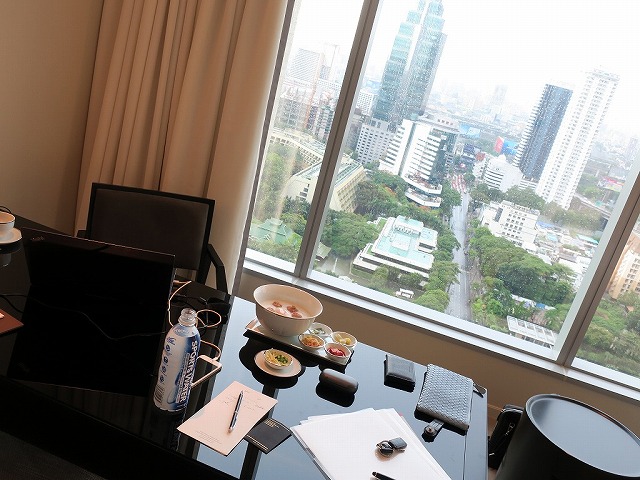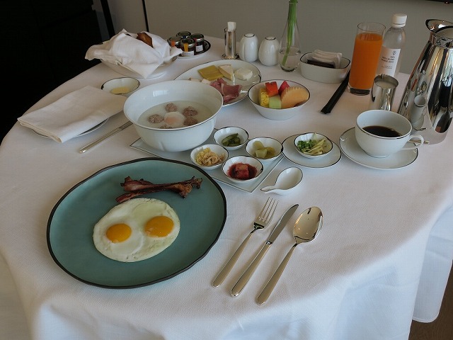 30分後に持って来て頂きます。内容はザ・パークハイアット・ブレックファーストに中国粥を付けてお願いしました。オレンジジュースは例のボトルジュースです。バンコクのしっとりした雨の景色を見ながら美味しく頂きますが、時間が無いためPCで処理をしながらの食事になってしまいました。日本人的には行儀は悪いのですがたまにはね・・・
