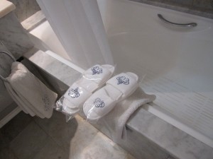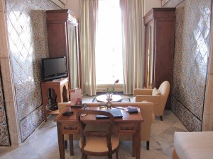 部屋の構成はリビング兼ベッドルームにバスルームというシンプルな構成です。また寝ると良く分かるのですが天井がとても高くできています。しかも四角ではなく全体的に丸みを帯びています。部屋の装飾も渋い木で作られており適当なような歴史があるような・・私には判断できないほどです。しかし部屋の中はタオルも含めて良い香りがしているのでまだ良かったです。