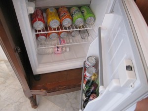ここでテレビを見ながら時間をと思いましたがテレビもほとんど見れるチャンネルがありません。窓の外を見ると格子の外に素晴らしい景色が広がるので、ここは部屋もそうですが外を歩いて楽しむ場所だと思い出しました。テレビの下にはミニバーがあるのですが、これはある程度充実していました。