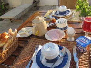 食事は基本的にパティオを抜けてプールサイドで頂きます。朝食の時には心づくしのセットが出てきます。ハムなどはご愛嬌ですが全体的に美味しく頂けました。私はゆで卵を二つ毎回頂いて元気を付けていました。食後にノンビリトしているとスタッフが何かと話しかけてきます。しかもお爺さんお婆さんなので英語ではありません。何語かわかりませんが何か話しながら渡してくれることが多くありました。一番よかったのはハーブを頂いたことです。これを部屋に持って帰るとさらに良い香りが部屋を満たしてくれました。