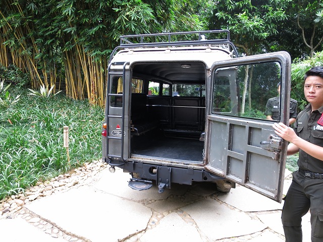 眠い目をこすりながらも、8時30分からご飯を食べて、9時にはそのままレストランから出発です。レストランの前で合流して古い古いランドローバーで移動します。象はホテルの敷地内にいます。今回は3名で受講します。
