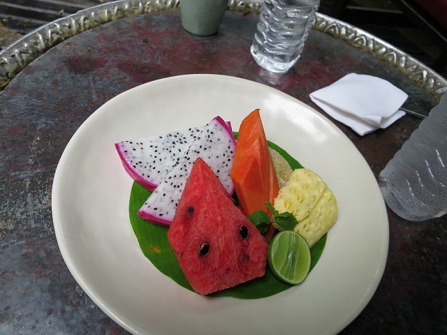 無事に終えたところでプールに移動してフルーツを頂きます。結構、緊張していたせいかとても喉が渇いていたことにこの時点で気が付きました。あまーいフルーツも体に染みます。水浸しの体ですが部屋に戻ってシャワーを浴びればスッキリです。「象に乗って冒険に出た」と楽しめる内容でした。