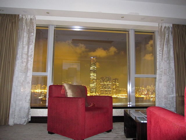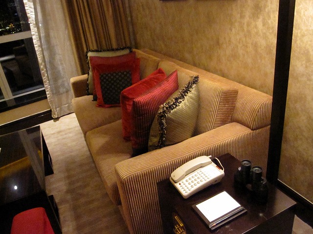 ソファーにはクッションも多くありゆったりと友人たちと会話を楽しむには良い場所でした。隣の机には電話機と双眼鏡があります。これで外を見ると、窓からは対岸が良く見えます。香港の夜景を楽しむには良い時間でした。