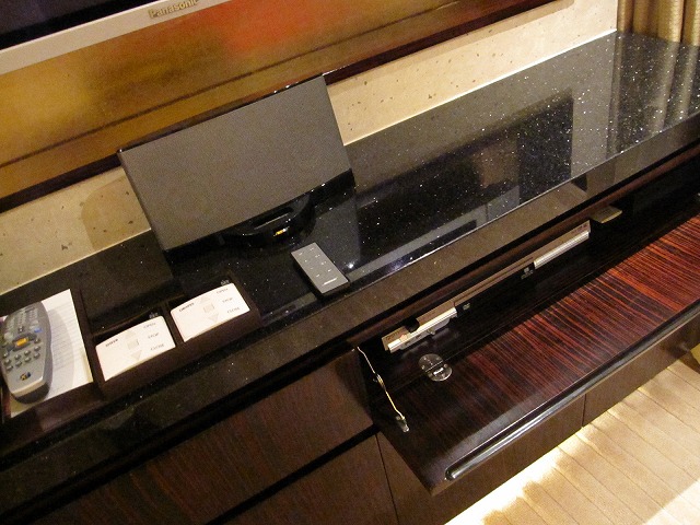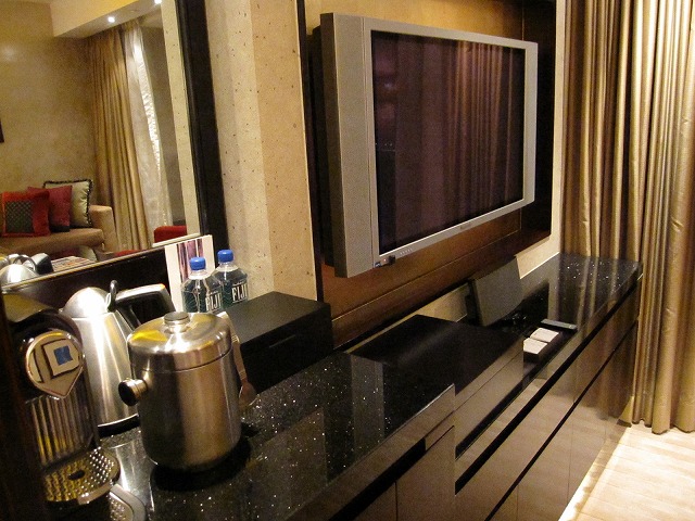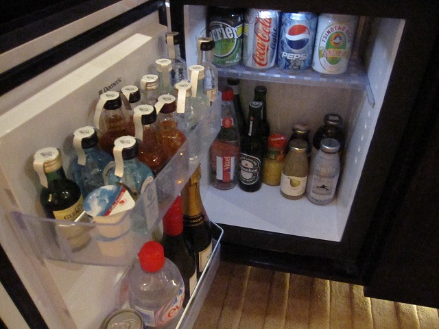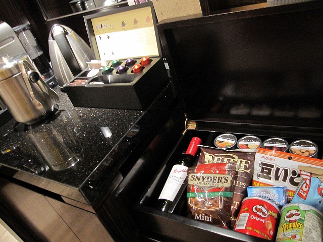 ソファーの向かいにはテレビが置いてあります。テレビだけでなく、iPhoneのドッキングステーションやDVDも綺麗に設定されています。テレビの下がミニバーになっていますがセットが悪くありません。冷蔵庫の中身も十分な品揃えです。もちろんスナックも箱を開ければ十分に準備されています。私は少し小腹が空いた時にはプリングスを頂きます。更に隣にはエスプレッソマシーンももちろんあります。