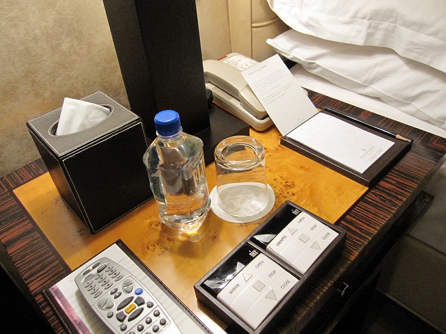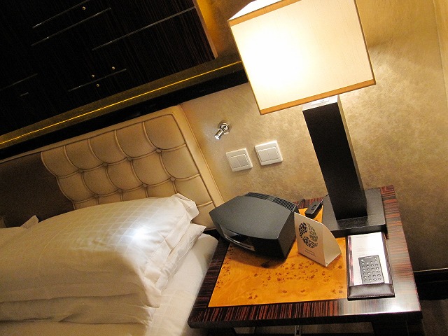ベッドルームもシンプルですが非常に快適に作られています。 勿論寝るときもカーテンは全開です。おかげで朝はスッキリ目覚めれました。またベッドのデザインも最高です。壁との一体感もあります。ベッドの横には水、時計、電話そしてスイッチと総てが当然のようにそろっていました。 面白いのは電動カーテンの制御用のスイッチが少し変わっていることですね。操作は簡単です。