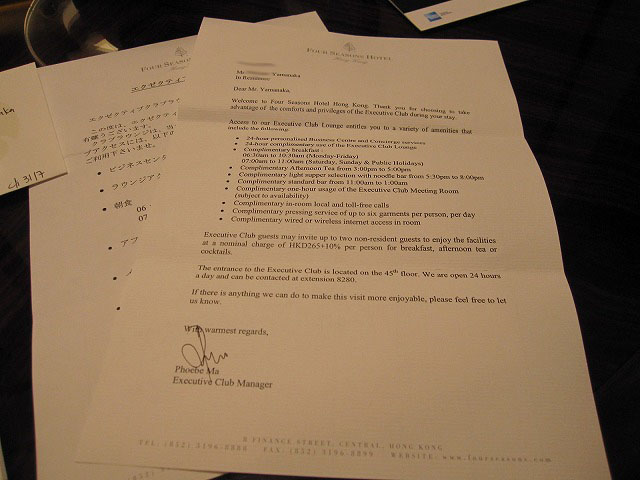 手紙にはベネフィット等も記載されています。ついでに日本語での文章もありましたね。私にとって有難いのはアフタヌーンティとプレッシングサービスでした。