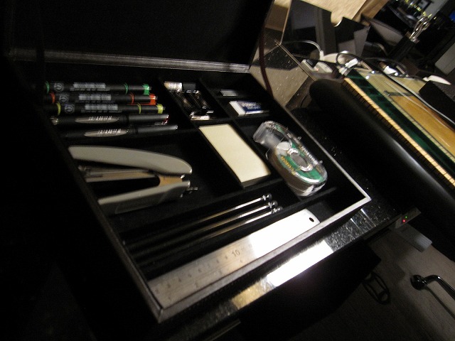 部屋の中には書斎とテレビとソファーもあります。書斎の上には文具も準備されています。マーカー・クリップ・鉛筆・ホッチキス・テープ・定規と必要な物が一通りそろって言います。電源も奥にありますが、日本のプラグも使えます。220VなのですがPC等では問題ありません。