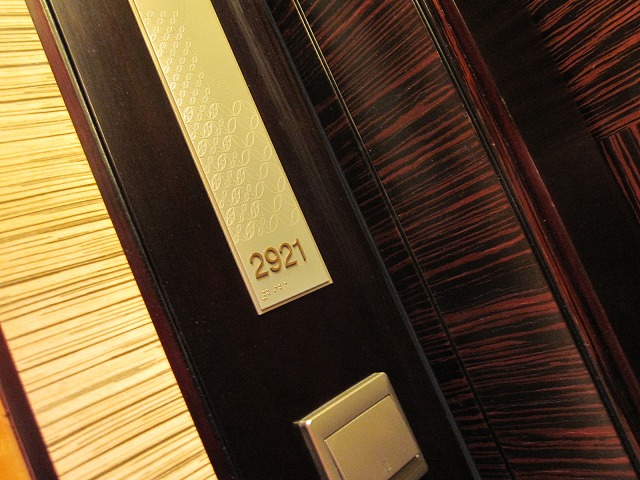 ホテルに到着すると深夜にも関わらずマネジャーが迎えてくれます。そのまま部屋に移動してルームチェックインとなりました。今回は2921号室に宿泊です。重厚な扉を開けて中に入ります。