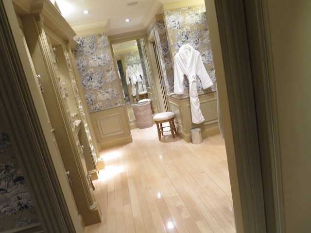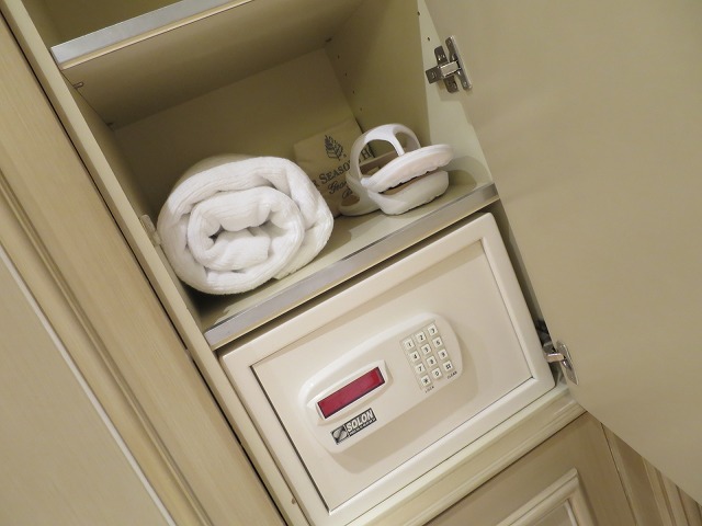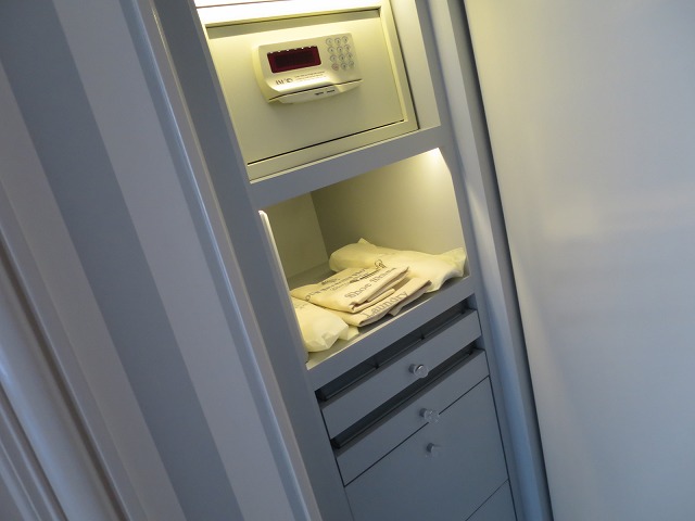 バスルームに向かう途中にはクローゼットがあります。二人で泊まってもサイズは十分です。横にはセキュリティボックスはもちろんですがラウンドリ・靴磨き用の袋もあります。袋には部屋番号のタグが事前についている辺りが一味違いますね・・・