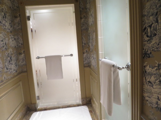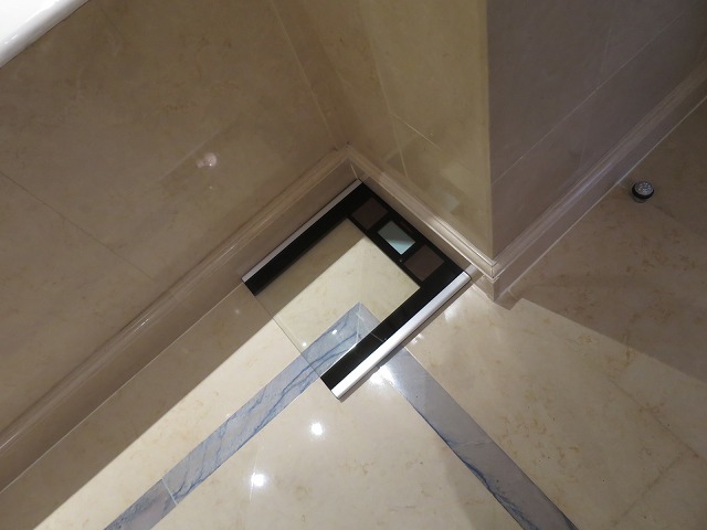シンクはダブルで此方も優雅な造りです。アメニティはブルガリが準備されていますが、私はブルガリのアメニティは苦手なので自分で持ってきた物を使います。テレビもガラスに埋め込まれているので音楽を聴きながらバスタブでのんびりと過ごすには悪くありません。ふと足元を見ると体重計もありましたが・・・怖くて乗れませんでした・・・