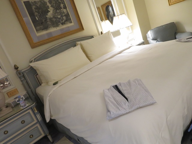 ベッドも広くて少し深みがあり包まれた感じになります。枕元には電灯と時計のみのシンプルな構成です。寝る前には浴衣が置いてありますが・・これは私にはあまり意味がありません。何故か・・・「浴衣が苦手」なのですね・・・何時も天空の森で購入した麻のパジャマかジョルジオ アルマーニのシルクのパジャマを持って来ています。これが私のお気に入りです。