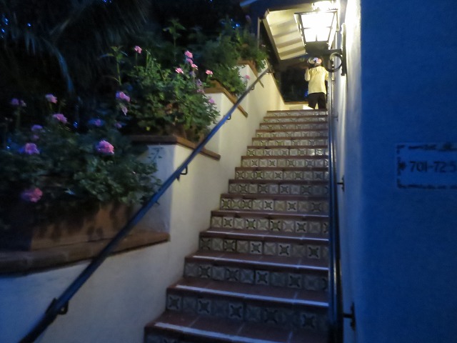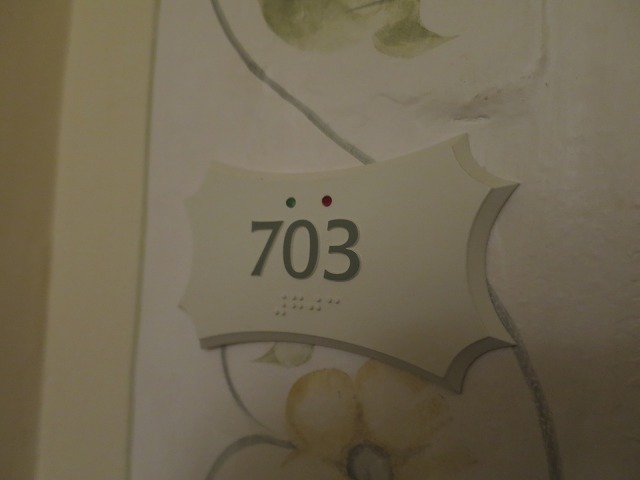 ロビーから広々とした敷地を少し移動していきます。一番ホテルの角の建物に到着し階段を上ると703号室です。