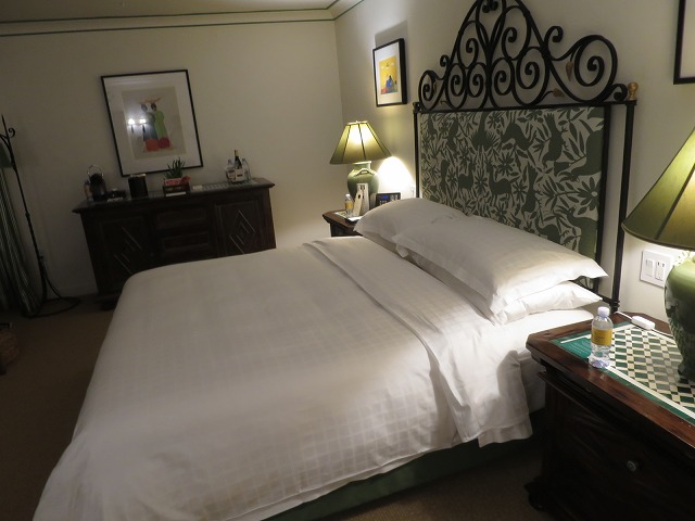 扉を開けると目の前には大きなベッドが目に入ります。少し硬めのベッドですが寝心地はやはり素晴らしく・・ベッドの左右には水が準備されています。また電話機もありますがベッドサイドの電話機は私はめったに使いません。