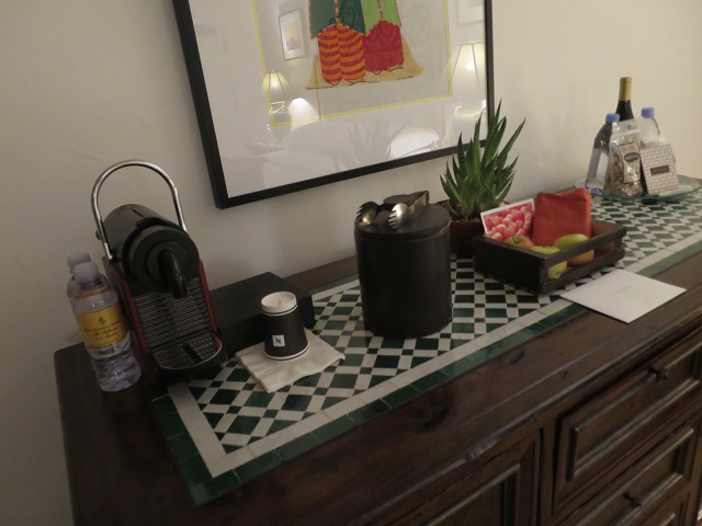 ベッドの向こうには大きな棚が見えます。上にはエスプレッソマシーン、リンゴ、水とならびます。コーヒーカップはかなり合理的になっていました。