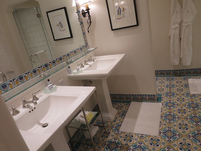 奥の扉を開けるとバスルームですがいきなり雰囲気がアップテンポに変わります。このデザインもなるほどです。お風呂場の下には床暖房が入っているのでお風呂を出てもホッカホッカです。やはりカリフォルニアでも冬は寒いですからね・・・
