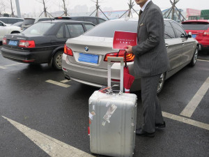 大連周水子国際空港に到着し荷物をピックアップして外に出るとグランド・ハイアットのパネルを持ったスタッフが待ってくれています。少し雨が降っていたので傘も準備されていました。車はピカピカのBMWです。スタッフは英語より日本語が上手く色々な話を教えて頂きました。
