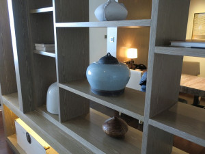 部屋に入るとデザインの良い棚に囲まれた通路になります。その先には窓越しに海が広がっており爽快な感じがします。