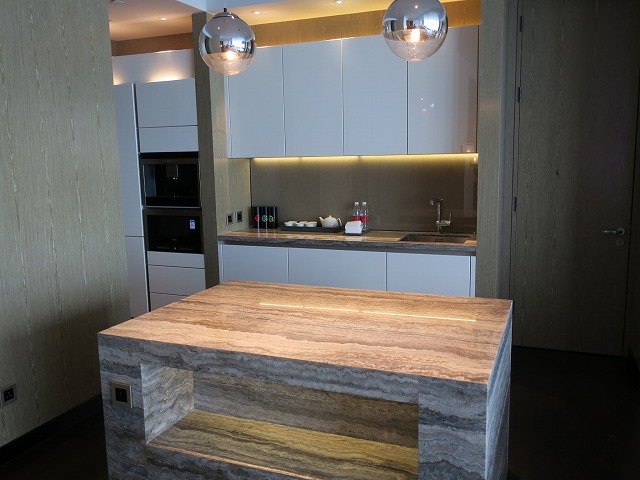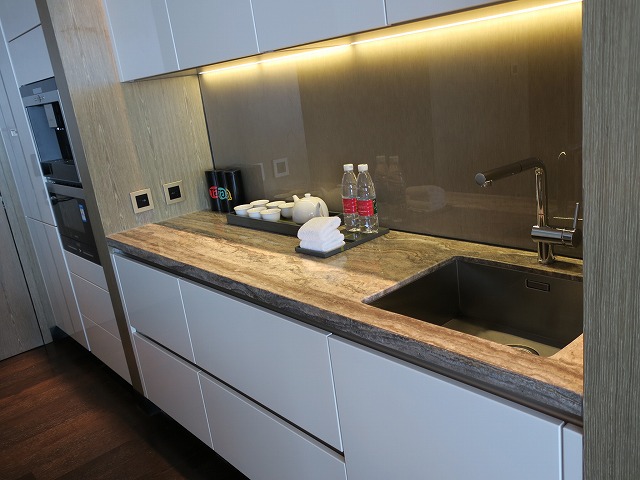 ダイニングテーブルの壁側にはキッチンが準備されています。ただのキッチンではありません。見せるためのキッチンシステムです。真ん中の大理石のテーブルではシェフが腕を振るうと凄く見栄えが良くなりそうな場所です。