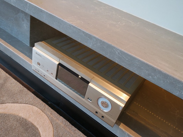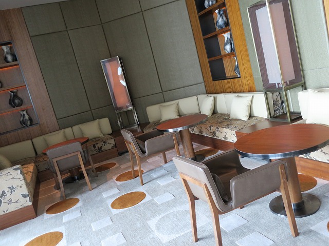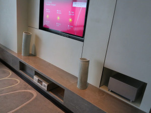 窓の前には丸いローテブルを囲んで8人ぐらいのソファーが準備されています。向かいの壁にはテレビが埋め込まれていますが音響システムも十分に揃えられています。流石に汚かったり工事が荒い部分はありません。