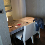 左手には6人掛けのダイニングテーブルです。今回は友人やスタッフが来る予定は無いので勿体ない造りです。ライトの作りなどは少し斜め上方向に良い感じです。