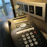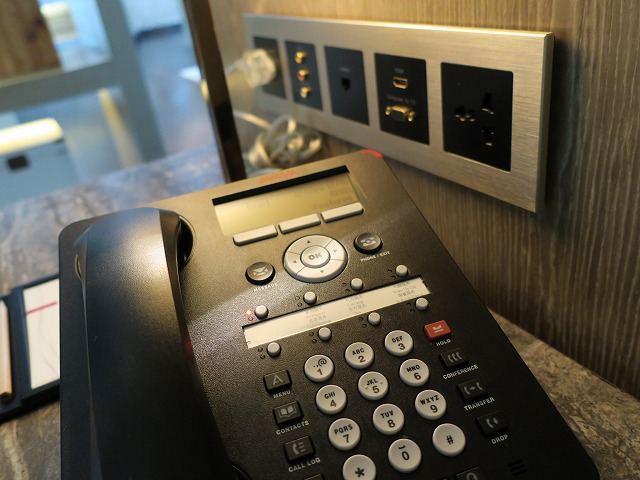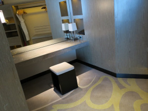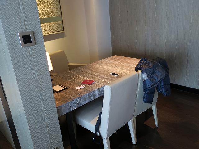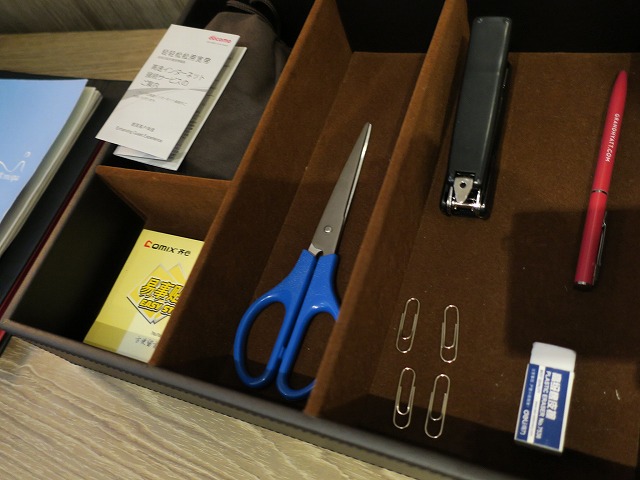 入口の棚の向こうが書斎です。大理石でできた机がとても重厚な感じです。壁側に電源のアウトレットやTVとの接続が準備されています。もちろんWiFiは無料で使用できます。中国なので規制はかなりされていますが、業務での使用は問題ありません。文房具は机の上に少しだけ最低限並んでいます。今回はこれで十分ですね。