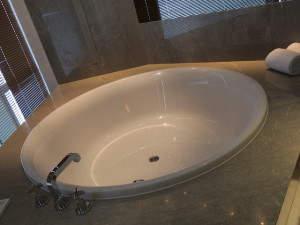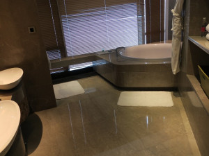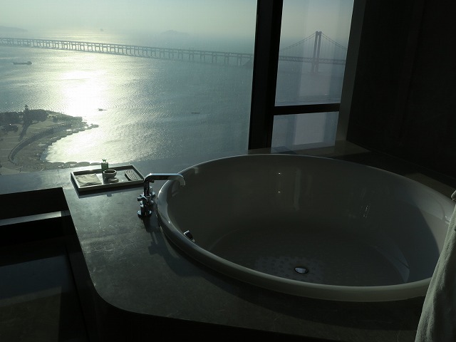 一番奥がバスタブですが丸く窓に面しているのが良いですね。大きさは十分すぎるほどで大連の海を眺めながら時間を過ごせます。バスソルトをたっぷりと入れて体を伸ばす時間は最高でした。残念ながら夜は何も見えません・・バスタブに面してテレビなども設定されています。