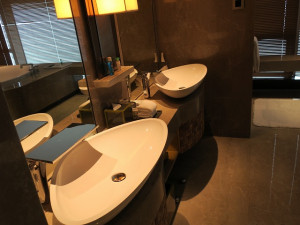 更に一つトーンが落ちた部屋になり、ダウンライトが綺麗に使われています。ダブルのシンクは貝のような形で蛇口の形も今時です。私はあまり得意な形ではありませんが・・