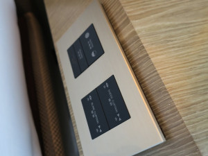 ベッドサイドにはブラインド・シェードの電動コントローラが着いています。もちろん私は全開で寝て朝日と共に目を覚まします。